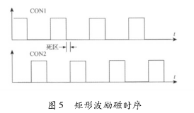 該電路主要由勵磁時序發(fā)生單元、三態(tài)緩沖器及隔離光耦組成。勵磁時序由冷凍鹽水流量計系統(tǒng)的控制核心產(chǎn)生。采用DSP的EPWM外設(shè)模塊,通過設(shè)定其內(nèi)部定時器的工作模式發(fā)出所要求的勵磁頻率的勵磁時序PWM信號CT_1和CT_2。由于勵磁控制系統(tǒng)中的勵磁工作電源的電壓要比DSP的工作電源電壓高得多,為防止勵磁電路故障對系統(tǒng)控制核心產(chǎn)生致命影響,采用光耦將控制部分與勵磁部分進(jìn)行隔離。另外,由于DSP引腳的驅(qū)動能力有限,所以在DSP與隔離光耦之間加入三態(tài)緩沖器以驅(qū)動隔離光耦的輸入級。并且,DSP能夠通過GPIO口控制三態(tài)緩沖器上的使能引腳來使能和禁止勵磁,以在檢測到電路故障時迅速關(guān)斷H橋所有橋臂。該勵磁時序產(chǎn)生電路通過軟件編程可產(chǎn)生如圖5所示的單頻矩形波。在實際應(yīng)用中,由于組成H橋的達(dá)林頓三極管與MOS管導(dǎo)通與關(guān)斷的時間不一致,易在勵磁方向切換瞬間,產(chǎn)生上下橋臂同時導(dǎo)通的現(xiàn)象,反映在勵磁電流波形上為一幅值很高的窄脈沖。該脈沖電流不僅容易引起遲滯比較電路的誤輸出,從而導(dǎo)致高低壓切換電路與電流旁路電路的誤動作,而且對恒流控制電路產(chǎn)生沖擊,減小三端穩(wěn)壓芯片的使用壽命,同時還會產(chǎn)生EMC電磁干擾,給測量精度帶來影響。所以實際應(yīng)用時,如圖5所示對方波勵磁時序添加死區(qū),可以明顯減小上述現(xiàn)象。