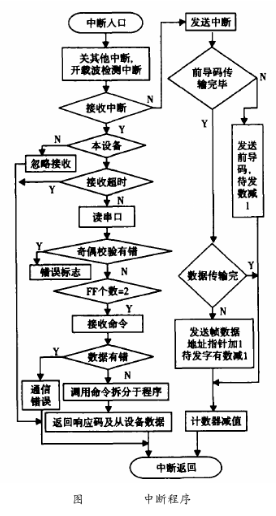 在HART通信中,地下污水流量計作為從設備進行通訊,所以這里的軟件設計只是針對于從設備。HART通信采用水平和垂直校驗的方法。當檢測到接收數(shù)據(jù)有差錯時,則等到主設備命令幀發(fā)完后,通知主設備數(shù)據(jù)接收有誤。主設備則重新發(fā)命令幀,從而保證通信的準確可靠。HART中斷子程序流程圖如圖6所示。由于HART通信為主從方式,HART幀中每個字節(jié)在物理層傳輸需要9ms左右,為了保證通訊的實時性,通訊程序采用串行口終端接收/發(fā)送。該中斷所要完成通信中的主要任務,即接收和發(fā)送幀,幀的拆分和打包。