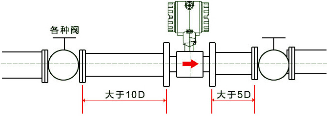 1、對直管段的要求:必須水平安裝在管道上(管道傾斜在5以內(nèi)),安裝時(shí)流量計(jì)軸線應(yīng)與管道軸線同心,流向要一致。上游管道長度應(yīng)有不小于2D的等徑直管段,如果安裝場所充許建議上游直管段為20D、下游為5D。