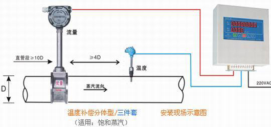 2、溫度補(bǔ)償一體型渦街流量計(jì)還帶有溫度傳感器,可以直接測量出飽和蒸汽的溫度并計(jì)算出壓力,從而顯示飽和蒸汽的質(zhì)量流量。