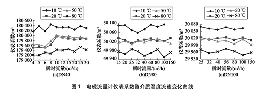 以山東省計量院DN50一D N400熱水流量標(biāo)準(zhǔn)裝置為實驗平臺,管道污水處理進(jìn)出水口流量計共3塊,分別為橫河DN40管道污水處理進(jìn)出水口流量計,科隆DN80管道污水處理進(jìn)出水口流量計,西門子DN100管道污水處理進(jìn)出水口流量計,精度均為0. 2級。3塊管道污水處理進(jìn)出水口流量計經(jīng)過多次校準(zhǔn)比對,性能穩(wěn)定。對管道污水處理進(jìn)出水口流量計在10, 20, 50, 80 ℃ 4個溫度點(diǎn)下進(jìn)行儀表系數(shù)及重復(fù)性測量,根據(jù)JJG 643-2003標(biāo)準(zhǔn)表法流量標(biāo)準(zhǔn)裝置》的要求選取流量點(diǎn)3。