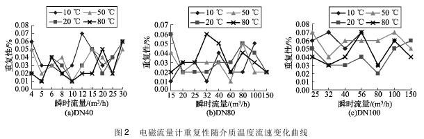 將實驗測得的dn150深井水流量計在不同溫度及流速下的重復(fù)性數(shù)據(jù)整理,特性曲線如圖2所示,3組曲線分別對應(yīng)DN40、DN80、DN100的3塊dn150深井水流量計的重復(fù)性曲線。