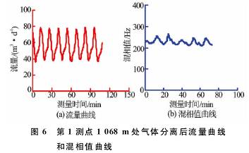 T-××-××1井是大慶油田采油五廠1口水驅(qū)產(chǎn)出井,采用阻抗式含水率計(jì)在該井進(jìn)行了測(cè)試。圖3、圖4分別為測(cè)點(diǎn)深度1097.3m測(cè)量的流量及混相值曲線圖。2min的采樣時(shí)間內(nèi),流量及混相值曲線波動(dòng)劇烈,明顯受井下產(chǎn)氣影響,進(jìn)行平均值計(jì)算時(shí)只能取后半段較平穩(wěn)的數(shù)據(jù),因此,測(cè)試時(shí)需延長(zhǎng)測(cè)量時(shí)間。錄取不同范圍數(shù)值時(shí)流量及含水率測(cè)量差值較大,流量平穩(wěn)段為14.81m3/d,高值時(shí)達(dá)到23.52m3/d;取不同測(cè)量段的混相值時(shí)測(cè)量含水率*大相差12%。重復(fù)測(cè)量得到了相同的測(cè)量結(jié)果。由此可見(jiàn),氣體對(duì)流量及含水率測(cè)量產(chǎn)生了非常大的測(cè)量誤差。