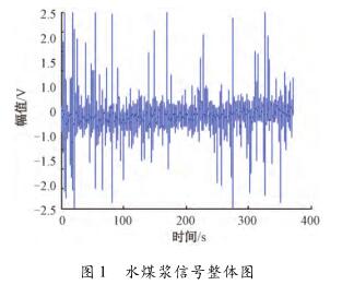 針對管道式水流量計測量水煤漿時出現(xiàn)較大波動,甚至回零這一問題,特去某煤化工企業(yè)甲醇分公司進行現(xiàn)場數(shù)據(jù)采集。該公司所使用的對置式四噴嘴氣化有4個噴嘴,噴嘴管道口徑為125mm,管中水煤漿流量基本穩(wěn)定在19m³/h(流速約為0.48m/s)。每條噴嘴煤漿線上安裝了3臺管道式水流量計,每臺管道式水流量計由傳感器和變送器兩部分組成。選擇其中1條水煤漿管線上的1臺管道式水流量計進行數(shù)據(jù)采集,因為該臺管道式水流量計測量結果波動大,甚至出現(xiàn)回零的現(xiàn)象。將課題組研制的基于DSP的電磁流量變送器的信號線和勵磁線接到該電磁流量傳感器的電極和勵磁線圈上,組合成完整的管道式水流量計,進行水煤漿數(shù)據(jù)采集。使用的電磁流量變送器是以TI公司DSP芯片TMS320F28335為核心,采用高頻勵磁方案,其硬件主要包括勵磁控制系統(tǒng)和信號采集處理系統(tǒng),具體的模塊有勵磁驅動模塊、信號調(diào)理采集模塊、信號處理控制模塊、人機接口模塊、通信模塊及電源管理模塊。信號調(diào)理采集模塊中的調(diào)理電路對一次儀表輸出的信號進行放大和濾波,截止頻率是2kHz,放大倍數(shù)約為230倍。通過NI公司USB-6216型號的數(shù)據(jù)采集卡進行數(shù)據(jù)采集,把調(diào)理電路的輸出端連接到數(shù)據(jù)采集卡的一個差分輸入端,并設置數(shù)據(jù)采集卡工作在差分的測量模式,設置采集卡的采樣頻率為10kHz。采集多組水煤漿信號數(shù)據(jù),每組數(shù)據(jù)的時間長度為5min。