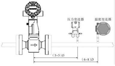智能渦街流量計的口徑如果與工藝管道相同,不能滿足流量儀表要求時,或者在此流速下測量準確度不能保證時,需要縮小儀表口徑,從而提高管內流速,保證測量精度。上下游必須有足夠的直管段,若傳感器安裝點的上游在同一平面上有 2 個 90°彎頭時,上游直管段≥25D,下游直管段≥5D。根據(jù)測量的需要,需在智能渦街流量計附近測量壓力和溫度時,測壓點應在傳感器下游的(3 ~5)D 處,測溫點應在傳感器下游的(6 ~8)D 處,如圖 3 所示。