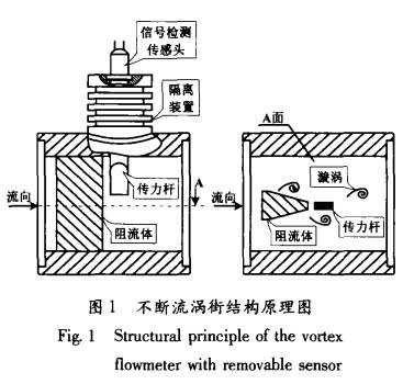 不斷流渦街同樣是以卡門渦街原理為依據(jù)測(cè)量流體流速的,但不斷流渦街表體已經(jīng)在結(jié)構(gòu)上有了質(zhì)的改變。如圖1所示,它將普通渦街單一的信號(hào)檢測(cè)傳感頭改變?yōu)閭髁U與信號(hào)檢測(cè)傳感頭兩部分,并通過隔離裝置完全隔離。當(dāng)表體中流過流體并產(chǎn)生漩渦時(shí),由傳力桿檢測(cè)漩渦的變化,并以力的形式傳遞給信號(hào)檢測(cè)傳感頭,完成了力信號(hào)到電信號(hào)的轉(zhuǎn)換過程。雖然傳力桿與流體直接接觸,但其本身只是進(jìn)行力傳輸?shù)母軛U,因此,只對(duì)外形尺寸及鋼材選擇上具有要求。而信號(hào)檢測(cè)傳感頭是通過隔離裝置與流體完全密閉隔離的,再加上隔離裝置本身具有的散熱功能,使得信號(hào)檢測(cè)傳感頭的使用溫度要遠(yuǎn)遠(yuǎn)低于流體的實(shí)際溫度,從而有效地提高了普通信號(hào)檢測(cè)傳感頭的可測(cè)介質(zhì)溫度。同時(shí),不斷流渦街在進(jìn)行維修更換信號(hào)檢測(cè)傳感頭時(shí),并不影響工藝管道內(nèi)流體的流動(dòng),真正實(shí)現(xiàn)了信號(hào)檢測(cè)傳感頭的不斷流拆裝維護(hù)。