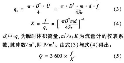 式中:m為漩渦發(fā)生體兩側(cè)弓形面積與管道橫截面面積之比;D為表體通徑,~;d為漩渦發(fā)生體迎面寬度,~;f為漩渦的發(fā)生頻率,Hz;U:為漩渦發(fā)生體兩側(cè)平均流速,耐s;sr為斯特勞哈爾數(shù);U為被測(cè)介質(zhì)來流的平均速度,耐s。管道內(nèi)體積流量q。為: