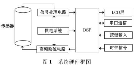 高頻勵(lì)磁煤焦油流量計(jì)由傳感器、高頻勵(lì)磁電路、信號(hào)處理電路等組成,其中高頻勵(lì)磁電路決定著傳感器磁場(chǎng)的強(qiáng)弱,勵(lì)磁電路的穩(wěn)定性以及精確性決定著系統(tǒng)檢測(cè)的準(zhǔn)確性以及穩(wěn)定性。DSP 系統(tǒng)控制勵(lì)磁電路激勵(lì)傳感器線圈,當(dāng)線圈中有導(dǎo)電液體流過時(shí),其切割磁感線并在傳感器兩端的線圈上產(chǎn)生感應(yīng)電動(dòng)勢(shì),利用信號(hào)檢測(cè)電路監(jiān)測(cè)感應(yīng)電動(dòng)勢(shì)的大小,*后根據(jù)相應(yīng)關(guān)系計(jì)算出液體的流量,系統(tǒng)硬件框圖如圖 1 所示。