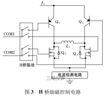 由圖 3 可知,I o 為高低壓切換恒流控制電路輸出的恒流源電流,H 橋驅(qū)動(dòng)的 COM1 端控制三極管 Q 1和場(chǎng)效應(yīng)管 Q 4 的通斷;COM2 端控制三極管 Q 2 和場(chǎng)效應(yīng)管 Q 3 的通斷。L 1 表示的是勵(lì)磁線圈(傳感器中線圈),COM1、COM2 為正交的 PWM 波信號(hào),因此在勵(lì)磁線圈 L 1 的兩端會(huì)產(chǎn)生方波勵(lì)磁信號(hào)。檢流電路主要是用來檢測(cè)勵(lì)磁線圈中電流的變化,當(dāng)線圈中的勵(lì)磁電流方向變化時(shí),可以及時(shí)將此信息反饋給高低壓切換恒流控制電路中的比較器,從而實(shí)現(xiàn)切換高低壓源達(dá)到恒流控制的目的。