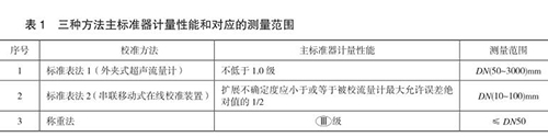 本規(guī)范包含三種校準(zhǔn)方法,分別為標(biāo)準(zhǔn)表法 1(外夾式超聲流量計(jì))、標(biāo)準(zhǔn)表法 2(串聯(lián)移動(dòng)式在線校準(zhǔn)裝置)和稱重法,編制組對(duì)每種方法進(jìn)行了大量的實(shí)驗(yàn),并積極與丙酮流量計(jì)生產(chǎn)廠家及用戶溝通探討,積累了豐富的經(jīng)驗(yàn),獲得了大量的實(shí)驗(yàn)數(shù)據(jù),*終確定三種方法的主標(biāo)準(zhǔn)器計(jì)量性能和對(duì)應(yīng)的測(cè)量范圍,如表 1 所示。