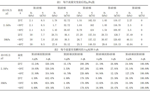 為了深入研究溫度及流量突變對高溫電磁流量計響應(yīng)速度的影響趨勢,把每個流量突變點前后的出口壓力p2,流量q列表如表1所示。