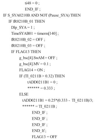(3)從 80℃升溫到 105℃,用時 120 min。升溫梯度=(105- 80)/24 = 1.04℃/300 s,蒸汽閥*大開度為 40%。根據(jù)多次生產(chǎn)經(jīng)驗總結(jié),進入該階段前 60 min,設(shè)定一個*低閥限 10%,可以避免釜溫波動過大;在該階段后期,如果蒸汽閥長時間保持較大的開度,就會造成反應(yīng)結(jié)束時釜溫沖到 110℃以上,影響二氯乙烷回收品質(zhì),所以在這一步有兩個特殊限制條件:①當(dāng)釜溫 >100℃,蒸汽閥門開度 >15%且持續(xù)保持 20 min 以上,升溫速率>1.05℃/400 s 時,自動關(guān)閉蒸汽閥;②當(dāng)該步進行時間大于 95 min 且蒸汽閥門開度 >16%持續(xù)保持 400 s 時,關(guān)閉蒸汽閥。