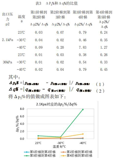 為了更直觀嚴(yán)謹(jǐn)?shù)膶?duì)比每個(gè)階段響應(yīng)速度的不同,對(duì)原始數(shù)據(jù)進(jìn)行處理,得到如下表格2和表格3。將△p2%/△q%作為響應(yīng)速度的直觀量化表達(dá),若△p2%/△q%的值大,說明單位流量變化照成的出口壓力變化大,即說明電磁流量計(jì)響應(yīng)相對(duì)較慢,反之亦然。