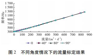 為了考察井眼斜度變化對電磁流量計測量流量的影響,開展了非集流高壓電磁流量計在不同斜度情況下的流量測量模擬實驗。模擬實驗在大慶油田多相流實驗室進行,儀器外徑 38 mm,模擬井筒內(nèi)徑為 124 mm,實驗介質(zhì)是水,傾斜角度分別為 0°、40°、80°和 90°( 水平) ,流量范圍為 5 ~ 850 m3 /d。實驗結(jié)果表明,在儀器居中條件下,井眼斜度變化對電磁流量計的儀表常數(shù)沒有影響,滿量程誤差不大于 4% ,因此可以應(yīng)用高壓電磁流量計進行水平井注水剖面測量。不同角度情況下的實驗結(jié)果如圖 2 所示。