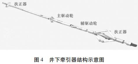 水平井注水井注入剖面測井工藝原理如圖 3 所示。在垂直井段,儀器在重力作用下可以通過注入管柱下入到井內(nèi),注入管柱下端須裝有喇叭口,且喇叭口應(yīng)在造斜點以上,保證測井完成后儀器順利起出,不發(fā)生卡儀器問題。儀器通過喇叭口以后在重力作用下繼續(xù)向下移動,當(dāng)儀器不能靠重力下移時,啟動牽引器,利用牽引器將儀器推送到井底,上提電纜過程中進行測井。