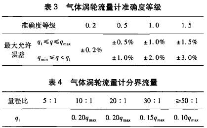 在GB21391--2008《用天然氣渦輪流量計測量天然氣流量》對分界流量q,有明確的定義,即低于該流量要采用擴(kuò)展誤差限的流量值。標(biāo)準(zhǔn)*5.2條從*大允許誤差和量程比兩方面對分界流量做出了規(guī)定,且明確了量程比是在*大允許誤差范圍內(nèi)流量計的*小流量和*大流量之比。該標(biāo)準(zhǔn)中對渦輪流量計要求的*大允許誤差如表1所示,量程比與分界流量q,的關(guān)系如表2所示。