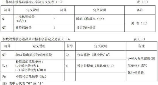 (3)標況流量計算公式(若補償后單位為 U.0):(4)標況流量計算公式(若補償后單位為 U.1):注:標況指 20℃,1 標準大氣壓三、一體化液晶顯示表頭參數(shù)設置操作說明(V03Z)1、鍵盤按鍵說明2、 顯示窗字符說明注:表中 x 代表“0”或“1”;Zn:標準狀態(tài)下(20℃,1 標準大氣壓),被測氣體的壓縮系數(shù),Z:工作狀態(tài)下被測氣體的壓縮系數(shù)3、 操作說明3.1、本儀表表頭采用自導引式和菜單式相結合的參數(shù)設置方式,所謂自導引式參數(shù)設置方式就是用戶在進入菜單 00 項后,表頭中的微電腦會自動導引用戶去設置需要設置的參數(shù)。另外,用戶也可以通過菜單模式分別對各組參數(shù)進行設置。蒸汽測量菜單框圖如下:3.2、參數(shù)設置約定:在設置各項參數(shù)時,提示符閃動代表該項參數(shù)沒有設置完或者尚未確認,可以通過按SET 鍵來確認或者按→鍵退出;提示符不閃動代表該項參數(shù)已設置完并確認,此時可以通過按 SET 鍵翻頁或者按→鍵退出。進入?yún)?shù)設置時,需要輸入密碼(6 位)并確認進入,為了防止誤進入?yún)?shù)設置菜單,保證儀表正常工作,在設置密碼時,使用↑鍵調數(shù)時不能循環(huán)調數(shù),只能單次調數(shù),只有密碼輸入正確進入各項參數(shù)設置菜單后才可以對各位循環(huán)連續(xù)調整數(shù)據(jù)。3.3、儀表參數(shù)設置舉例:儀表出廠前各項參數(shù)已設置好,用戶無需設置。如果用戶需要設置某項參數(shù),請參照以下步驟,例如修改刻度流量值 QT:在工作狀態(tài)下,按 SET 鍵,顯示屏顯示 P,數(shù)字位為全零,8 秒鐘若無操作,自動返回工作狀態(tài)。輸入密碼 :按數(shù)字↑鍵和左移←鍵,輸入密碼數(shù) xxxxx(出廠時默認密碼為 000123),↑鍵調各位數(shù)字 0-9,每按 ←鍵一次數(shù)字向右循環(huán)一位,可通過多次按←鍵對整段數(shù)字清零,按→鍵可以返回工作狀態(tài)。菜單選擇項:按 SET 鍵確認,顯示屏顯示如右圖所示,末行“00”閃動調整該項值選擇不同參數(shù)設置菜單。該例直接按 SET 鍵進入菜單 00 項設置刻度流量:QT 閃動,*一步:*先進行小數(shù)點調整,可以通過←鍵對參數(shù)快速清零或者通過↑鍵進行小數(shù)點調整,調整完畢,按 SET 鍵確認(QT 仍閃動);*二步:數(shù)值調整,可以通過↑鍵對每位數(shù)字進行調整,按 ←鍵一次數(shù)字向右移動一位,調整完畢,按 SET 鍵確認,QT 停止閃動,該項參數(shù)設置完畢,可進行下一項參數(shù)設置或者退出另外,單位設置 U.X 和補償方式設置 dX 通過↑鍵調整修改。3.4、校驗項說明: 儀表出廠前,溫度和壓力通道已校驗設置好,無需用戶重新校驗。校驗通道有密碼保護,廠家不對外開放,如果需要重新校驗溫度或者壓力通道,請專業(yè)人員與廠家技術人員聯(lián)系。4、計算公式說明4.1、蒸汽測量計算公式(1)渦街流量儀表工況體積流量計算公式:(2)密度 d,單位 Kg/m3(3)質量流量計算公式,單位 Kg/h:(4)質量流量計算公式,單位 t/h:4.2、氣體測量計算公式----標況指 20℃,1 標準大氣壓(1)渦街流量儀表工況體積流量計算公式:(2)對比壓縮系數(shù) d(Zn/Z),單位 1(3)標況流量計算公式,單位 Nm3/h:P1—工況絕壓,PN—標況絕壓(Mpa),T1—工況熱力學溫度,TN—標況熱力學溫度(K)