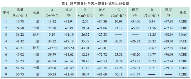 試驗(yàn)數(shù)據(jù)見(jiàn)表1,其中流量表示污水流量計(jì)60min內(nèi)的累計(jì)流量;A、B、C、D分別為4個(gè)型號(hào)的超聲波流量計(jì)在60min內(nèi)的累計(jì)流量;排名為與同一臺(tái)污水流量計(jì)比對(duì)的4臺(tái)超聲波流量計(jì)的誤差按從小到大的順序。